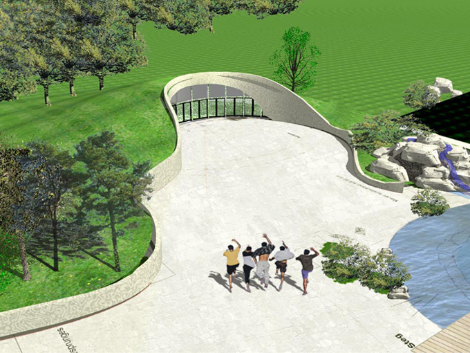 Es war der Wunsch des Bauherrn, ein Haus für Gäste, Empfänge und Besprechungen zu schaffen, das sich ganz in die vorhandene Landschaft einfügt. Eingeschoben in einen Hügel, wächst das Gebäude aus dem Gelände heraus, erhebt sich und verschmilzt wieder mit der vorhandenen Landschaft. Innerhalb des Gebäudes sind verschiedene mobile Zonen für Übernachtung, Be- sprechung und Catering untergebracht.