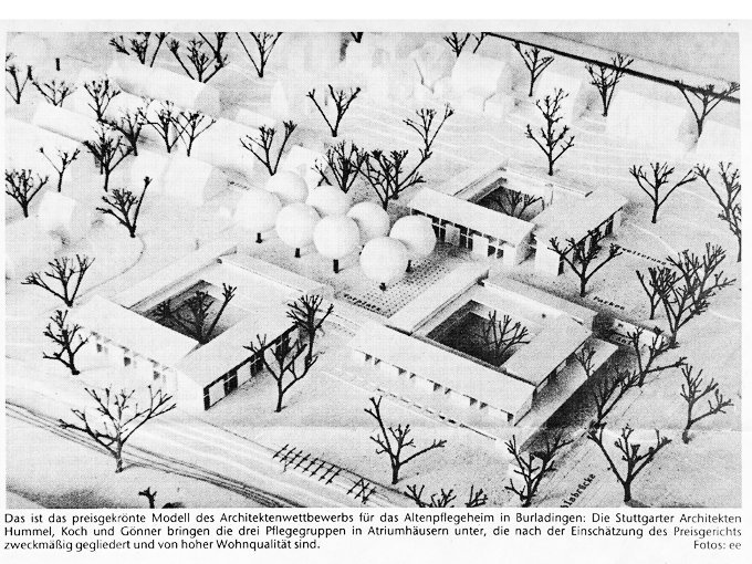 DEN AUSSCHLAG FÜR DEN ERSTEN PREIS für das Altenwohnheim in Burladingen HAT DIE WOHNQUALITÄT des geplanten Hauses GEGEBEN. DAS ALTENHEIM WIRD IN GROSSEN ATRIUMHÄUSERN UNTERGE- BRACHT, DURCH DEREN VERSATZ ANGENEHME FREIRÄUME ENT- STEHEN. Es wird auf grosse GESTEN verzichtet zugunsten von WEITRÄUMIGEN ENT- WICKLUNGEN IM EINGANGS- BEREICH. Sehr gut platziert sind CAFE, MEHRZWECKRAUM UND ANDACHTSRAUM, die sich ALS FLEXIBLE EINHEIT ZUM GROSSEN FREIRAUM IM SÜDEN hin orientieren.